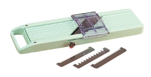 Let me introduce you to the Benriner. It is made in Japan and comes with assorted blades and a small plastic guide. I’ve had my Benriner for about 20 years. It is not fancy and as you can see this model has no container attachment for storing vegetables and I like that because it fits in your drawer without taking up too much space. You can find this at Amazon.com