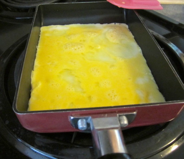 This little Japanese rectangular egg pan makes it simple to slice the egg into thin slivers once cooked.