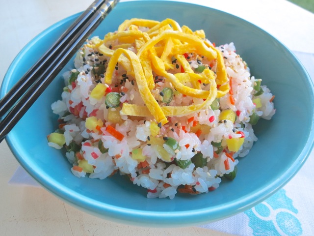 This is a simple variation on sushi rice or Chirashi Sushi which means scattered sushi. Hot rice is mixed with a vinegar sauce (sushi meshi) and colorful toppings are added. It’s an excellent side dish that goes especially well with grilled teriyaki chicken, beef, fish or tofu. If you want to make it in advance, I suggest making it the same day you plan to serve it since rice tends to dry out and harden the longer you refrigerate it.