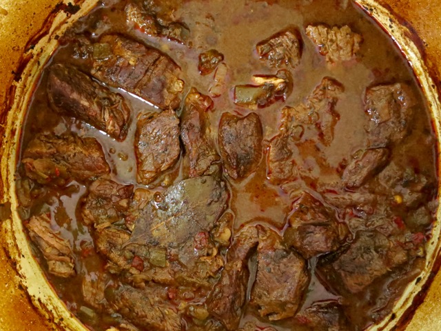 - Heat a few teaspoons of oil in a large Dutch oven or similar oven-proof pot with a cover over medium-high heat. Lightly season beef with kosher salt and a few grinds of pepper. Brown beef in two batches, adding more oil to the pan if needed. Beef should be nicely browned on two sides (let brown on one side for a few minutes without moving the beef). Adjust heat if too high. Remove beef to a platter and set aside.
