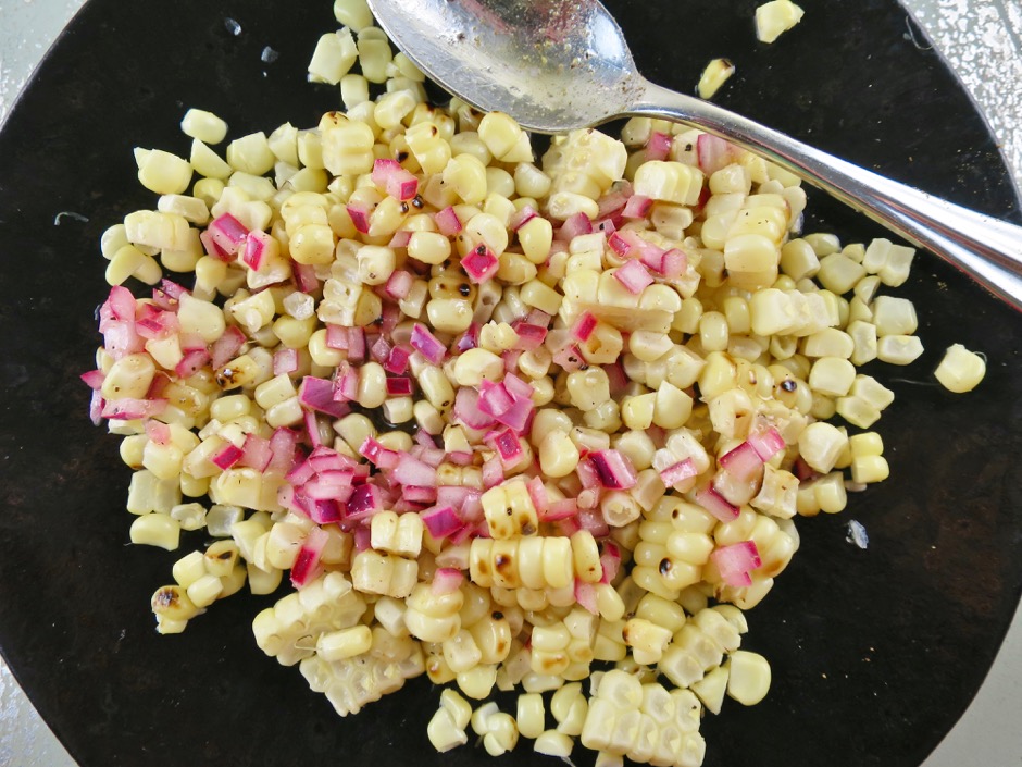 In the version above, the corn was grilled before tossing it with the dressing. I sprinkled Korean chili flakes over the salad before serving. You could also use Aleppo pepper or crushed red pepper flakes, or none at all. The salad below uses corn that was steamed for just a minute in the microwave. A few sprigs of watercress were tossed into the salad.