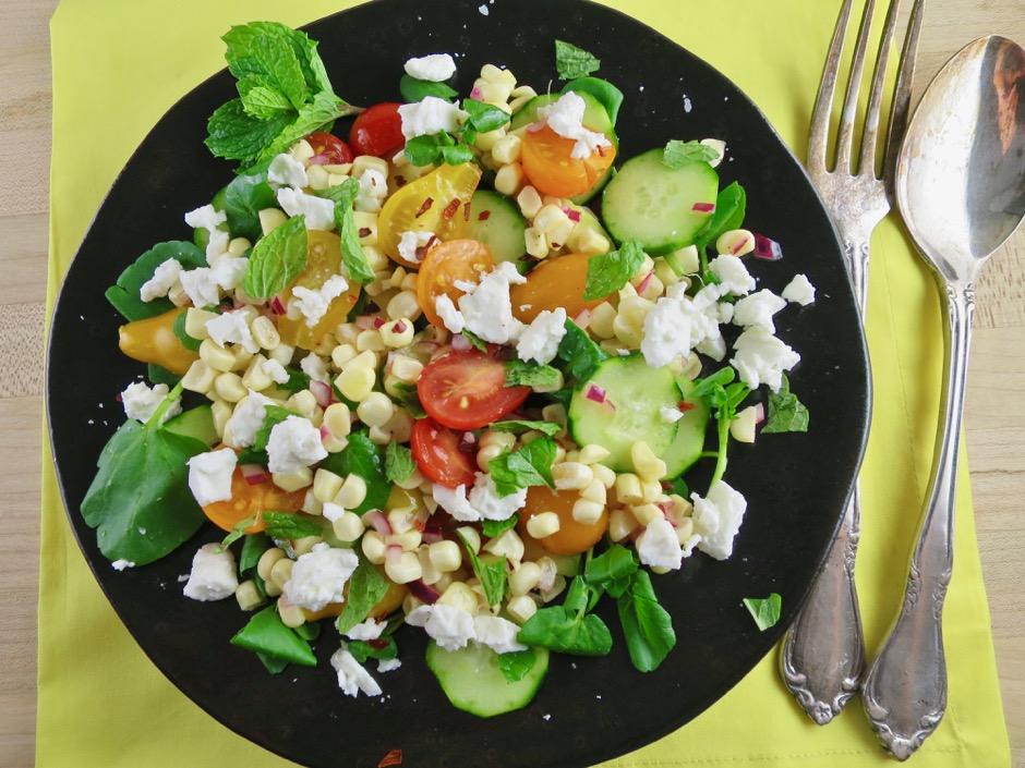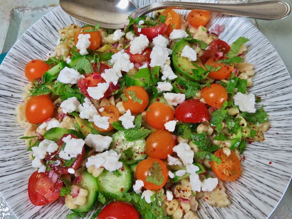 - Spoon the corn over the salad, Scatter feta and mint over the top. Sprinkle a bit of crushed red pepper over the salad. Drizzle with extra dressing and serve.