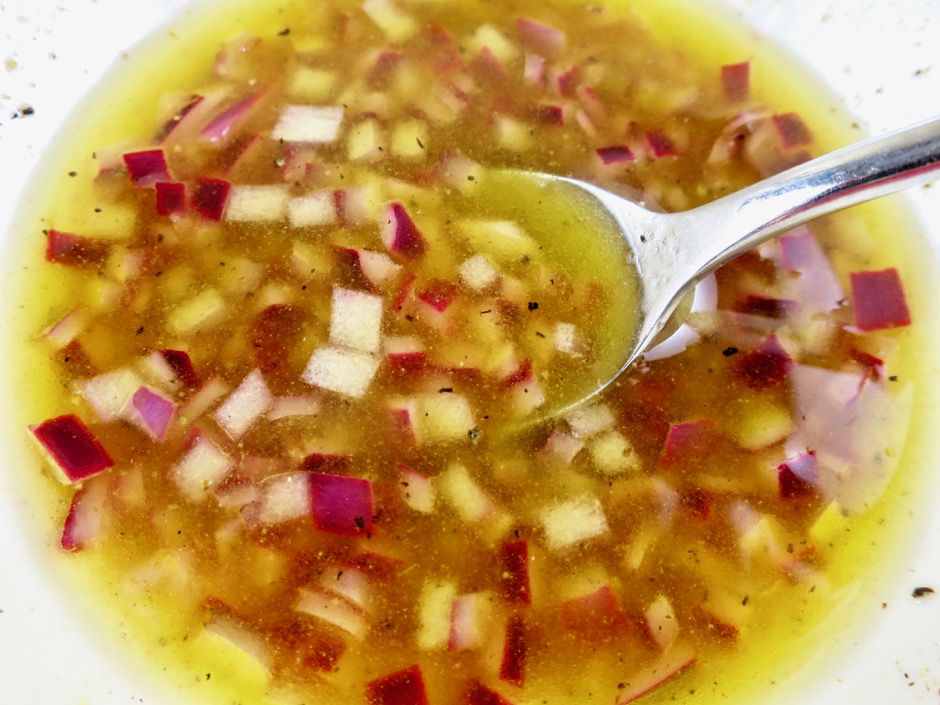 The dressing is quite simple to make. Mince some red onion and let it macerate in the lime juice for a short time along with fresh ground pepper and salt. Set the bowl aside while you slice the cucumbers and other vegetables. Finally, whisk in the olive oil and a bit of cumin.