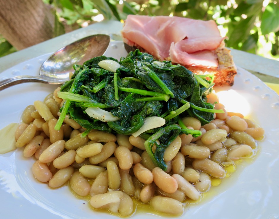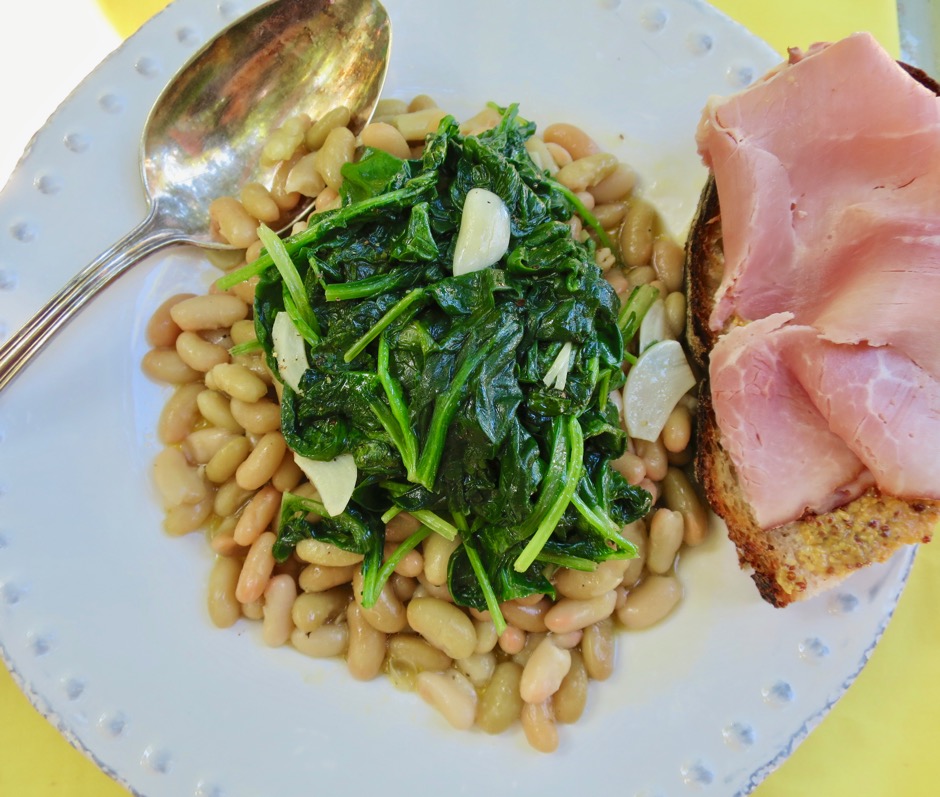 - To serve, place beans in a shallow bowl. Drizzle beans with a little olive oil. Top with the wilted greens and season with salt and pepper. I serve this with open-faced ham sandwiches but toasted garlic bread would be a delicious accompaniment as well.
