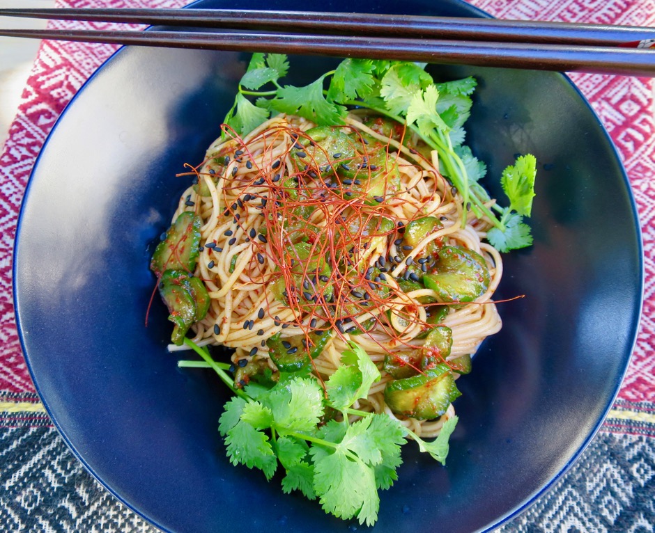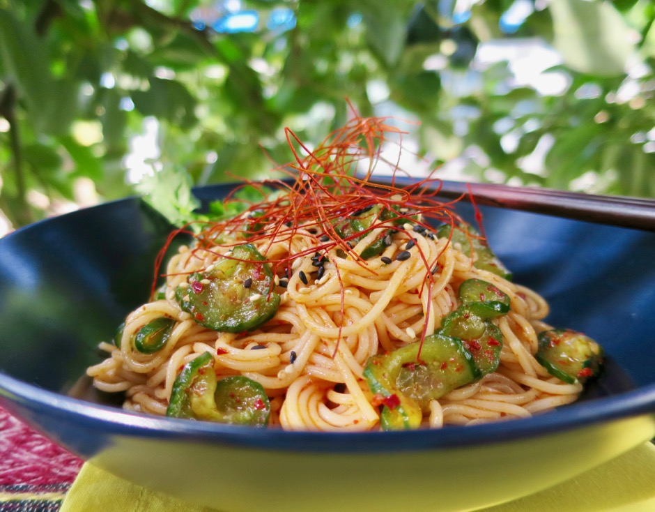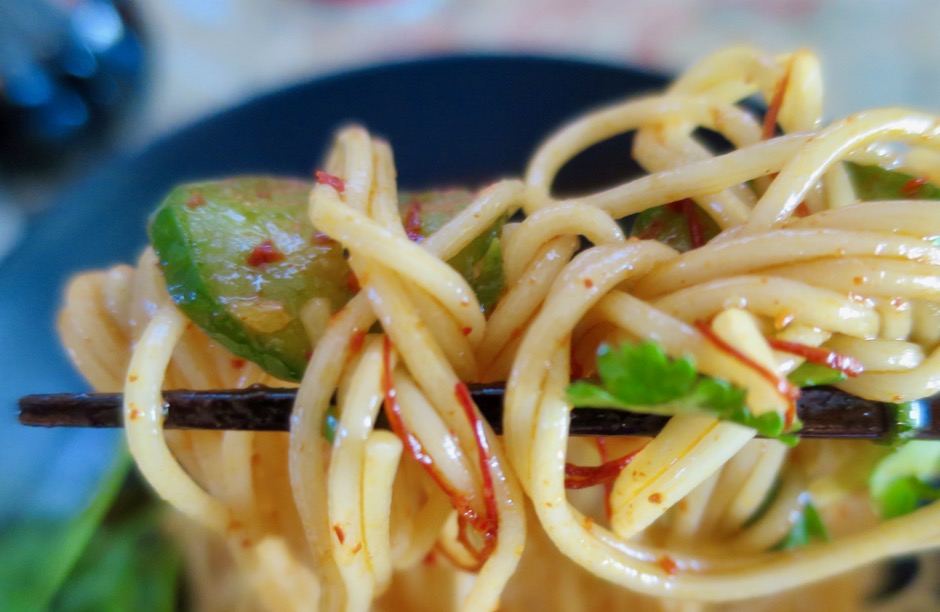 The cucumbers are mixed with Korean chili flakes, scallions, garlic, and sesame oil before being tossed with cold noodles.