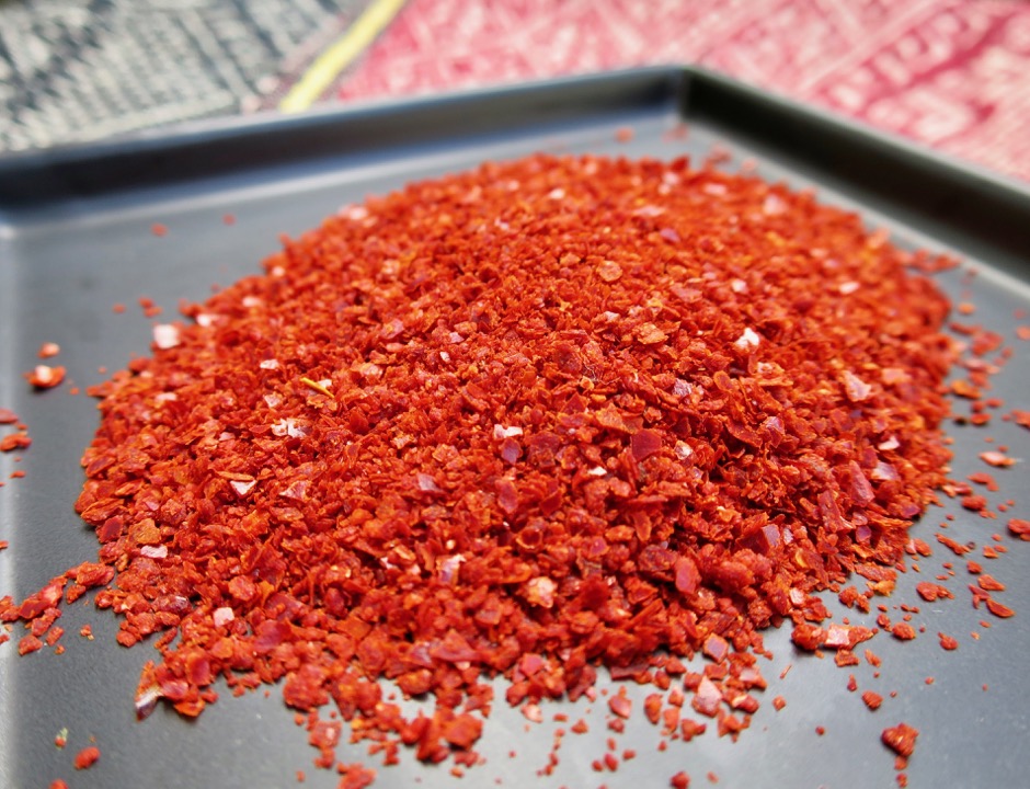 Korean chili flakes or gochugaru (not to be confused with red pepper powder), has a unique balance of sweet and smoky flavors with medium heat. I have heard that hotter varieties are available but the one I buy from Whole Spice tends to be just the right heat for me.