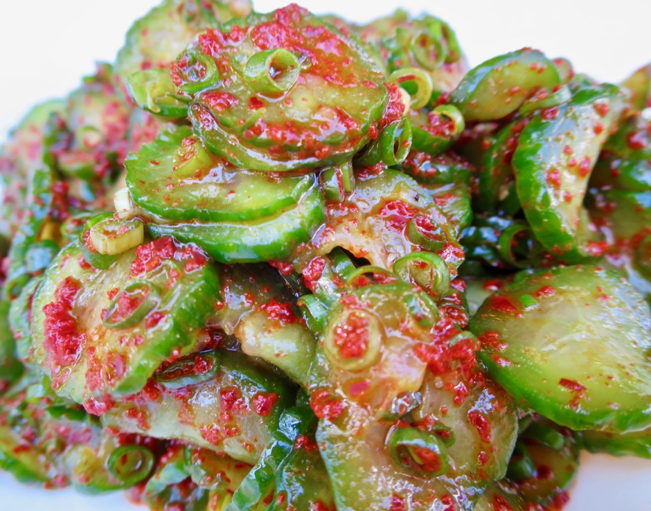 - Toss cucumbers with ½ teaspoon salt, and let sit for 30 minutes. Transfer cucumbers to a clean dish towel and wring to remove excess liquid from cucumbers. Transfer to a large bowl. Add Korean chili flakes, sugar, scallions, garlic, 2 tablespoons sesame oil, and the vinegar. Mix seasonings into cucumbers; let sit for 10 minutes.