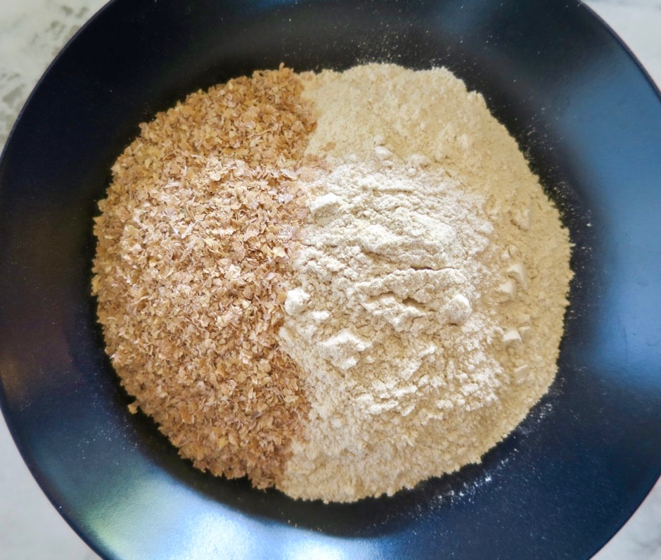 - Combine flour, wheat bran, baking powder, baking soda, and kosher salt in a large bowl. Stir with a whisk to combine ingredients.
