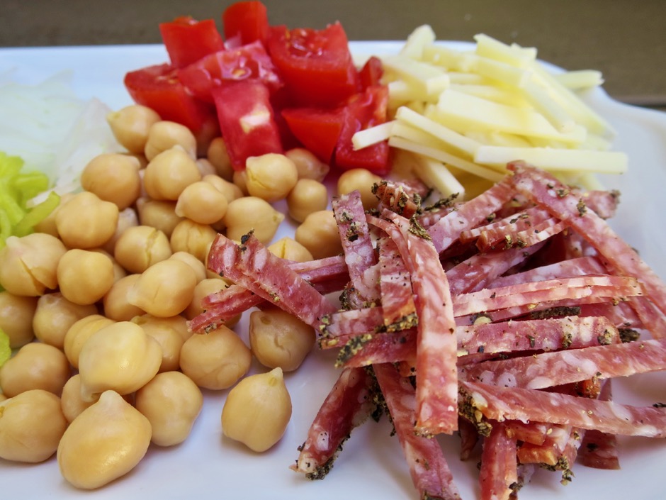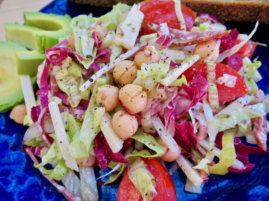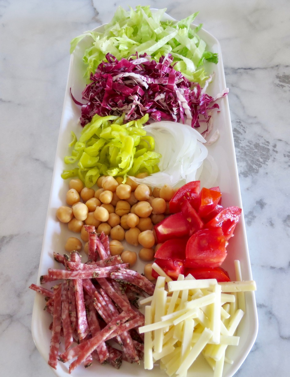- In a large salad bowl toss the lettuce, radicchio and onions together. Add tomatoes, chickpeas, cheese, salami and pepperoncini. Spoon dressing over the salad and toss well so that all ingredients are well seasoned with the vinaigrette. Taste and adjust seasoning with salt, pepper and more vinaigrette. You will not need all of the dressing. Store leftovers in the refrigerator and use within a week. Serve the salad with some good sourdough bread on the side.