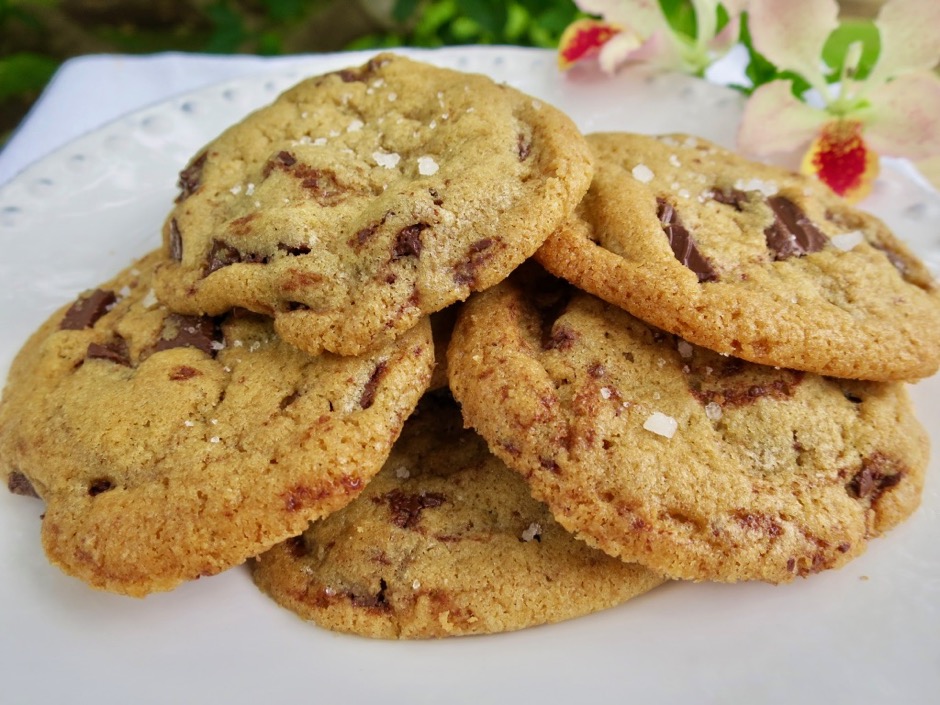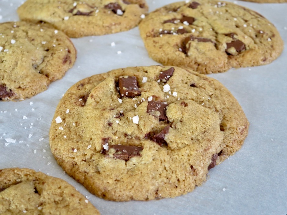 - Form the cookies into rounds using a medium sized (#40) cookie scoop. Place them evenly spaced on the baking sheets, about 3 inches apart (they spread a lot). Bake one pan at a time on the middle rack of the oven rotating the pan from front to back midway during baking. Bake cookies for about 14 minutes until the edges are golden brown. Remove the cookies from the oven and sprinkle with a bit of fleur de sel or Maldon sea salt. Let the cookies cool on the baking sheet for at least 5 minutes then transfer to a cooling rack. Continue to bake the remaining cookies.