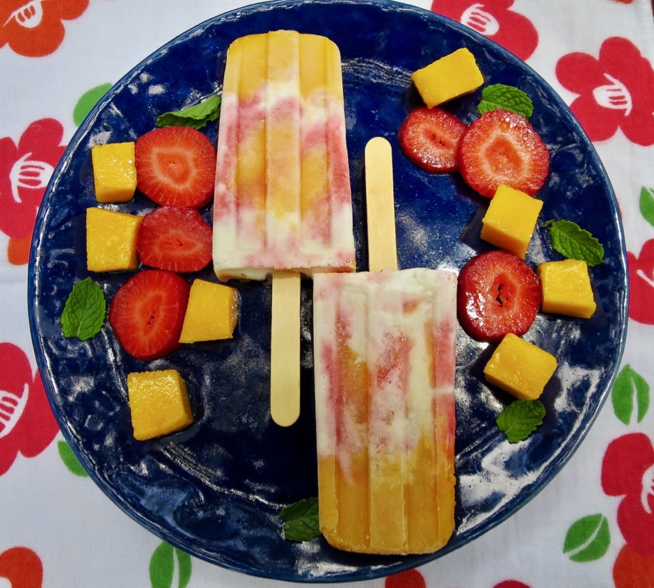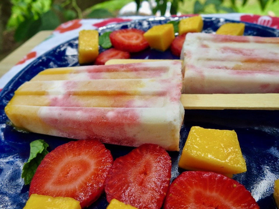 Most of us loved eating popsicles as children, a favorite summer treat. Embrace your inner child with these homemade delights. You won’t regret it and neither will your children, grand children, friends, and whoever else is lucky enough to eat one of your homemade creations. All you need for this recipe is fresh fruit and vanilla ice cream. Since our mango trees are at their peak summer harvest now they are the major ingredient here. Strawberries and vanilla ice cream added a beautiful color palette to the bright orange mangos. If mangos are not available, fresh peaches would be an excellent substitution.