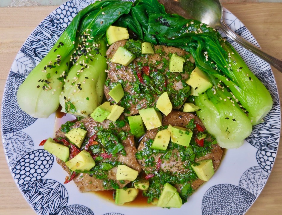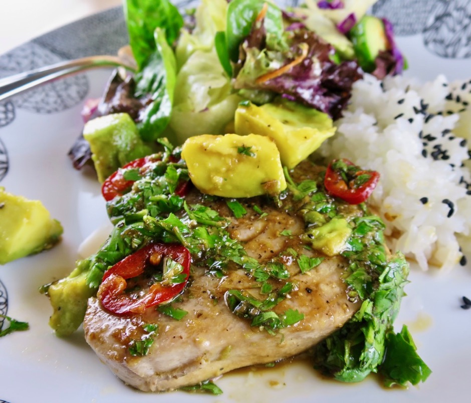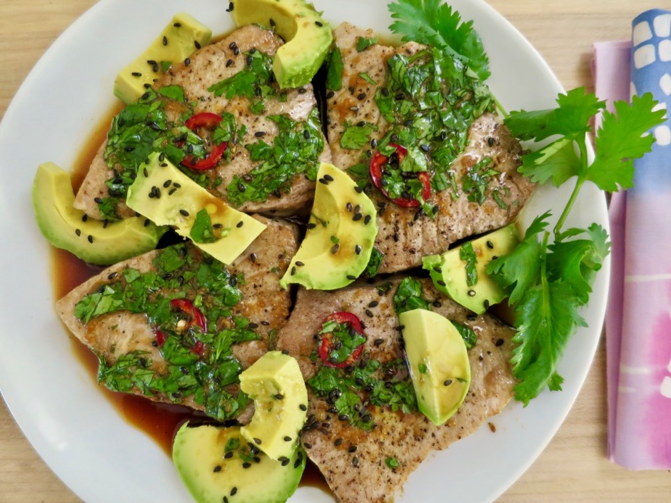 Finding good fresh ahi tuna has been a hit and miss endeavor until I discovered Oki’s Fish Market in the Kahului Foodland market. They always seem to have the freshest fish on a regular basis. So whenever I’m in the area, I’ll stop by to pick up a nice piece of ahi for dinner. This Tyler Florence recipe caught my attention for a few reasons. It’s quick, tasty, and uses lots of cilantro and avocado, two of my favorite ingredients. Now those of you who are cringing about cilantro, don’t give up yet. You could certainly switch out the cilantro and substitute it with a smaller amount of chives or parsley.