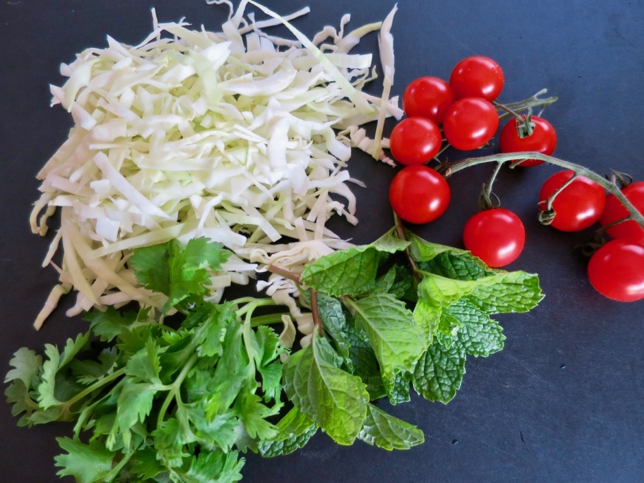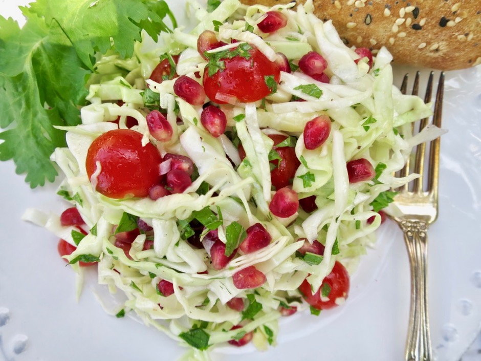 - Add chopped onion, tomatoes, mint, cilantro and pomegranate seeds to cabbage. Toss with dressing. Season to taste with salt and pepper before serving.