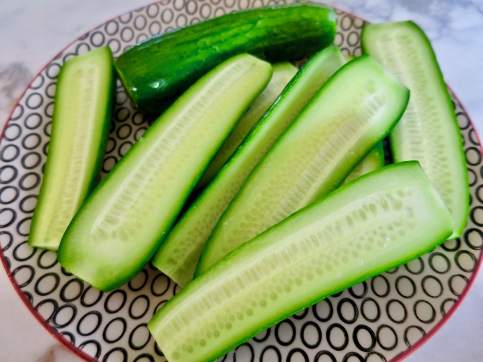 - Rinse cucumbers and pat dry. Cut crosswise into pieces about 4 inches long. Cut each piece in half lengthwise.