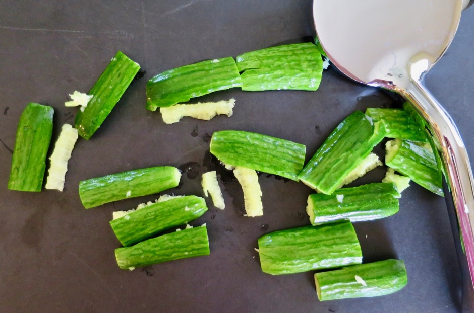 It’s amazing how the seed pockets detach from the cucumbers once they are smashed. I use my mallet which works perfectly. You can use the blade of a large knife if you don’t have a mallet (or a small skillet).