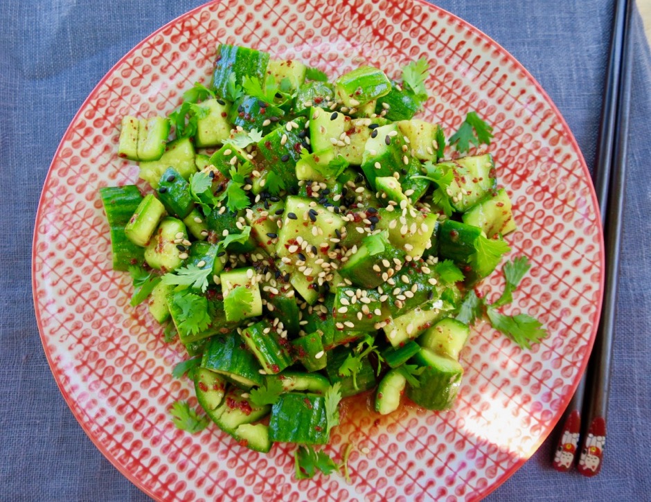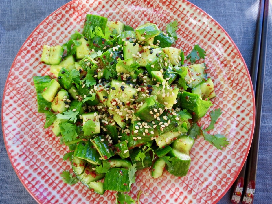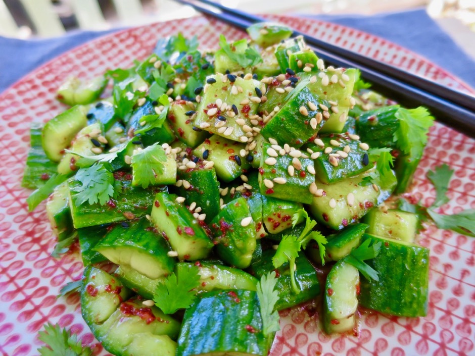 The dressing for the cucumbers is simple to prepare. Mix everything together in a small bowl, set aside until ready to serve. You could also drizzle this dressing over steamed bok choy, watercress, or blanched bean sprouts.