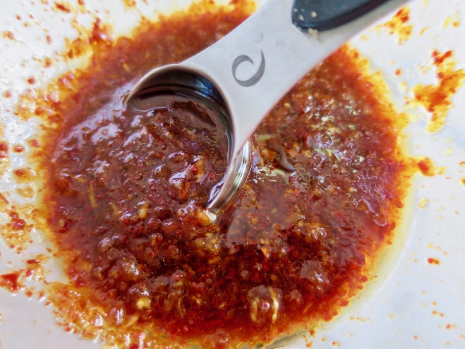 - In a small bowl, combine ¾ teaspoon kosher salt, 1 teaspoon sugar, and rice vinegar. Stir until the salt and sugar have dissolved. Stir in sesame oil, soy sauce, grated garlic, and Korean chili flakes.