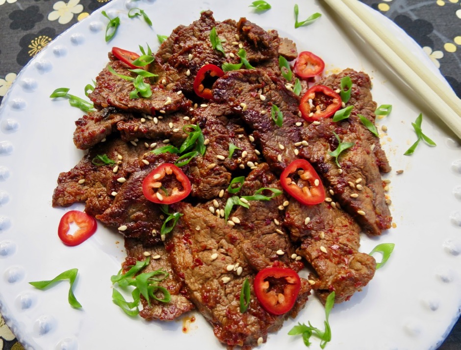If you want a quick, tasty meal, this Korean-style dish fits the bill. The thin slices of meat marinate in a flavorful sauce for just 30 minutes. A quick sear in a hot pan makes for perfectly cooked beef with crisp edges that are delicious served with a bowl of rice.