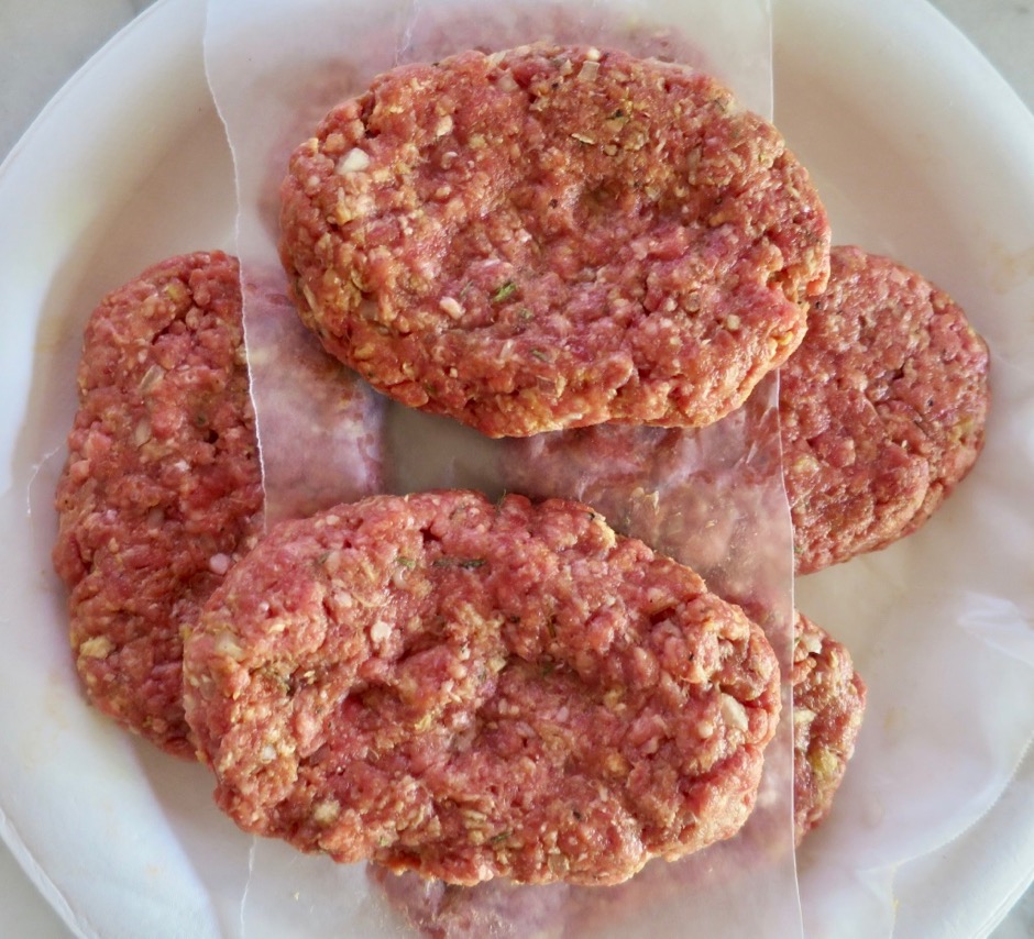 - Combine the first 12 ingredients (meat through pepper) in a large bowl. Gently mix to combine all ingredients. I use two forks to mix everything together. It takes a bit longer but ensures the patties stay light (not compacted) and tender. Form mixture into 4 oval shaped patties. If you prefer smaller patties shape mixture into 6 equal portions. You may prepare the patties a few hours in advance, store covered in the refrigerator.