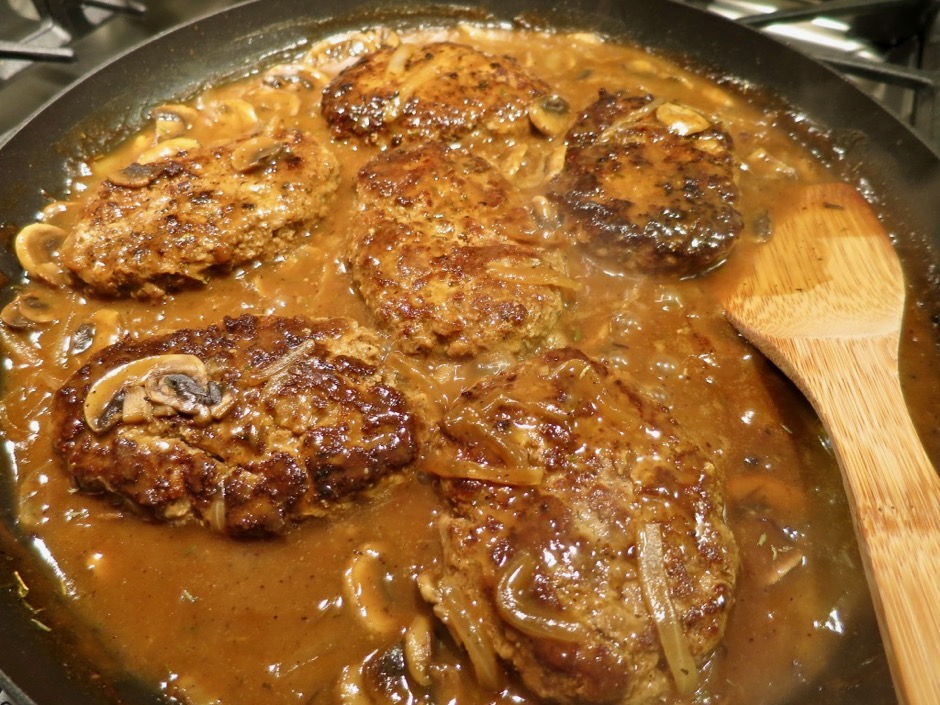 There is no such thing as too much gravy when it comes to Salisbury steaks. The secret ingredient to making a good sauce is demi-glace. It adds a luxurious richness to all types of brown sauces and gravies. I always have veal demi-glace portioned out in tablespoon measurements in the freezer. If there is one item you should splurge on, it should be demi-glace. You won’t regret it.