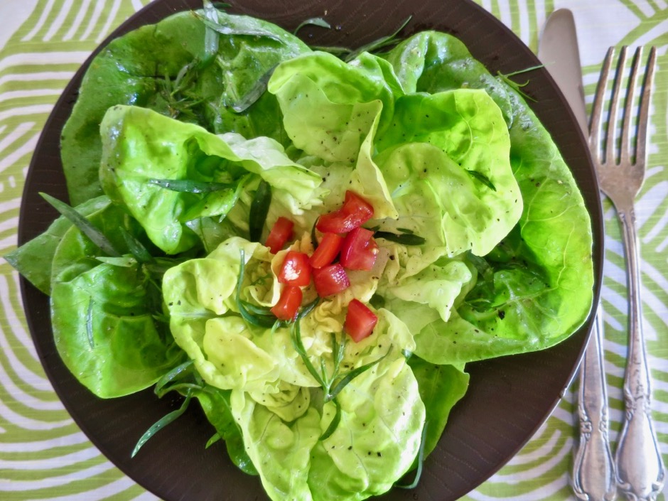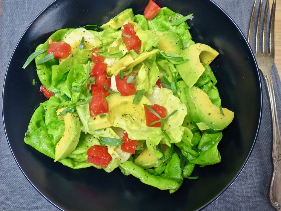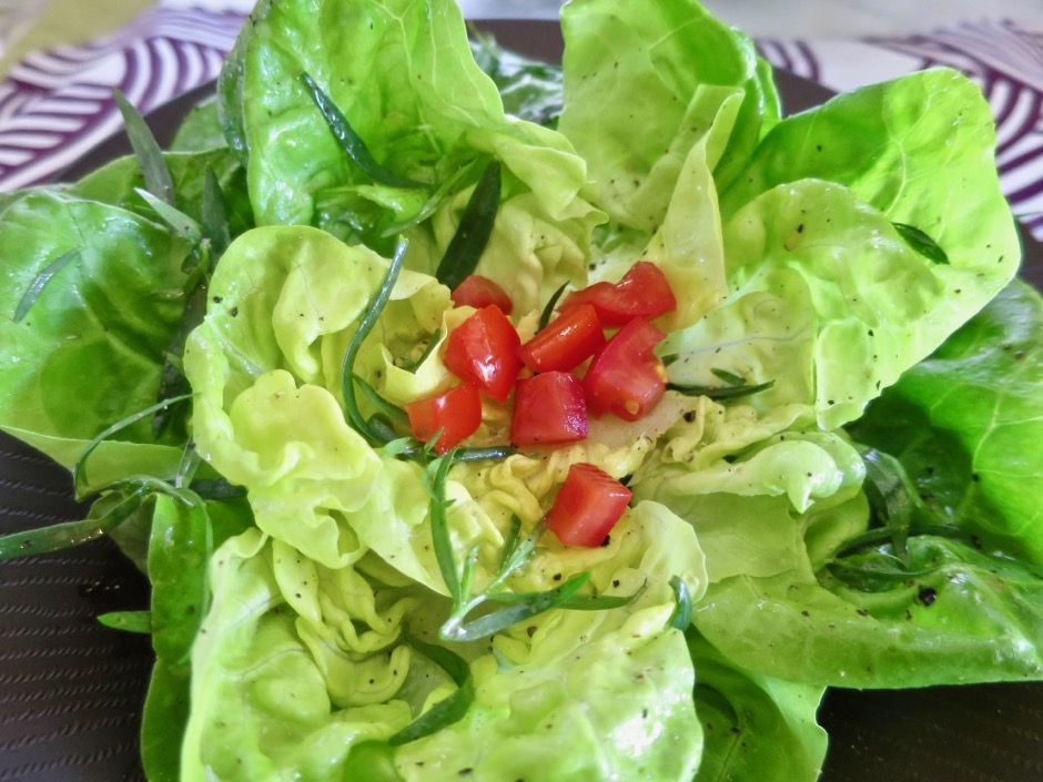 - Place whole lettuce leaves in a large bowl along with the tarragon leaves and drizzle enough vinaigrette to coat thoroughly. Season with additional salt and pepper. Stack lettuce leaves in 4 wide salad bowls, starting each stack with the large outer leaves on the bottom and ending with the smaller leaves on top. Scatter diced tomatoes and or sliced avocado over the lettuce leaves. Drizzle with additional dressing if desired before serving.