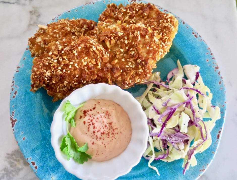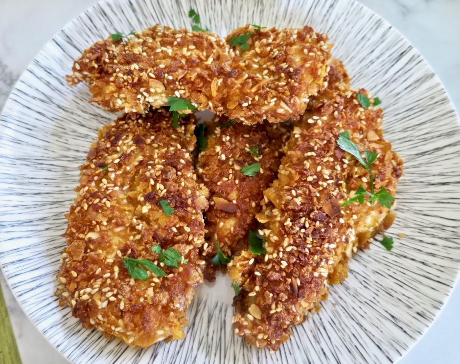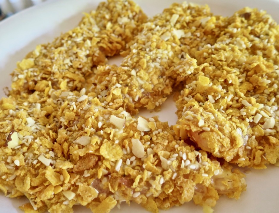 Many times panko or other types of bread crumbs are used for breading chicken, but this time I’m using crushed corn flakes.  The corn flakes, almonds and sesame seeds make a perfectly crispy coating.