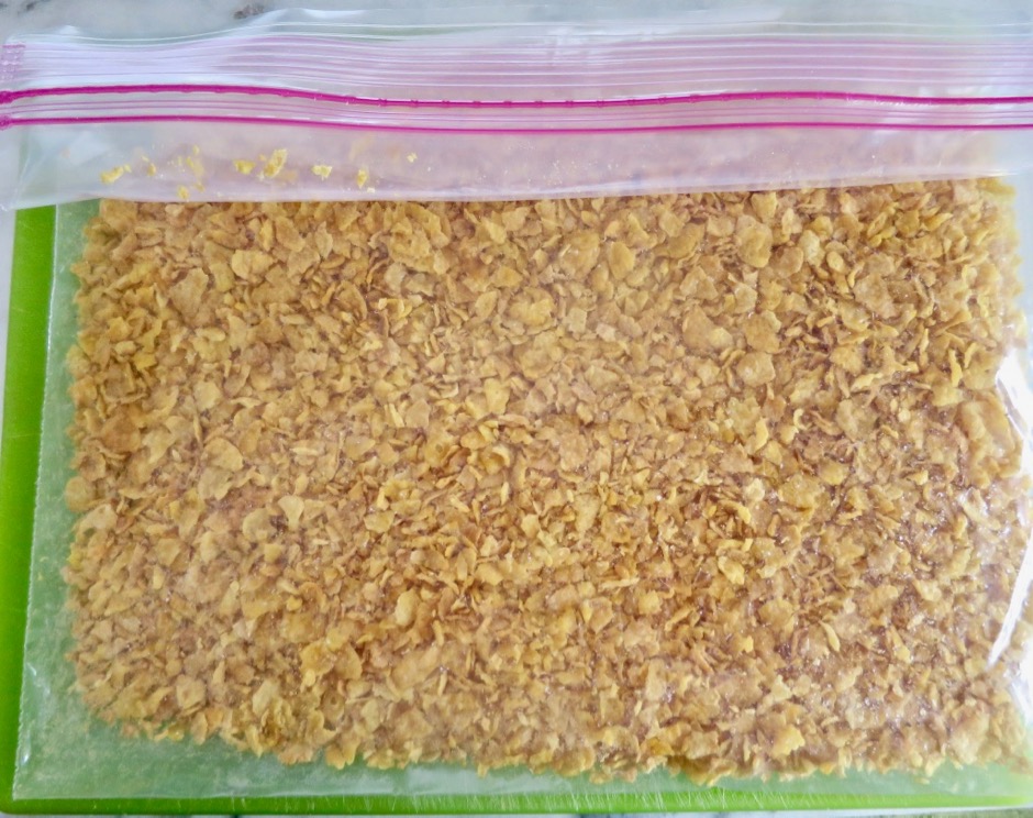 Crush the corn flakes and almonds in a Ziploc bag then toss in the raw sesame seeds. I use a smooth meat pounder but you could also use a small heavy pot or skillet and get the same results.