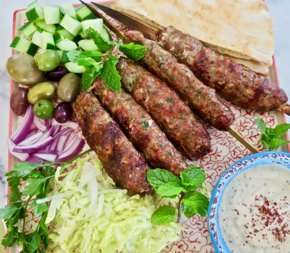 6. Serve kofta with warm pita bread or saffron rice along with diced cucumbers, tomatoes, red onion, assorted olives, shredded lettuce, fresh mint and tahini sauce.