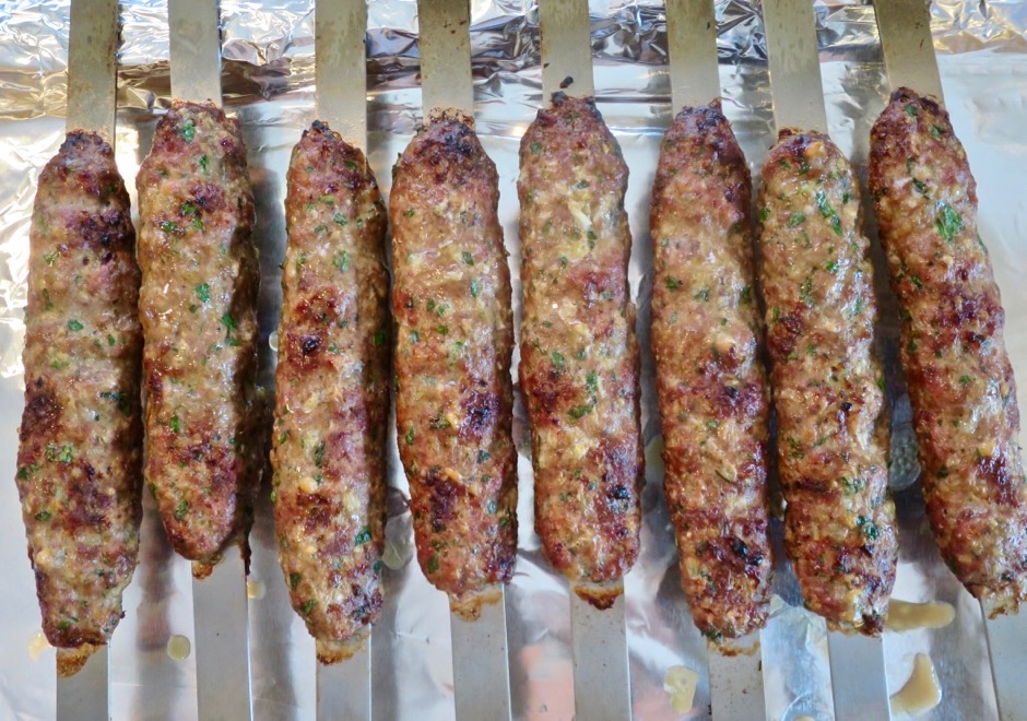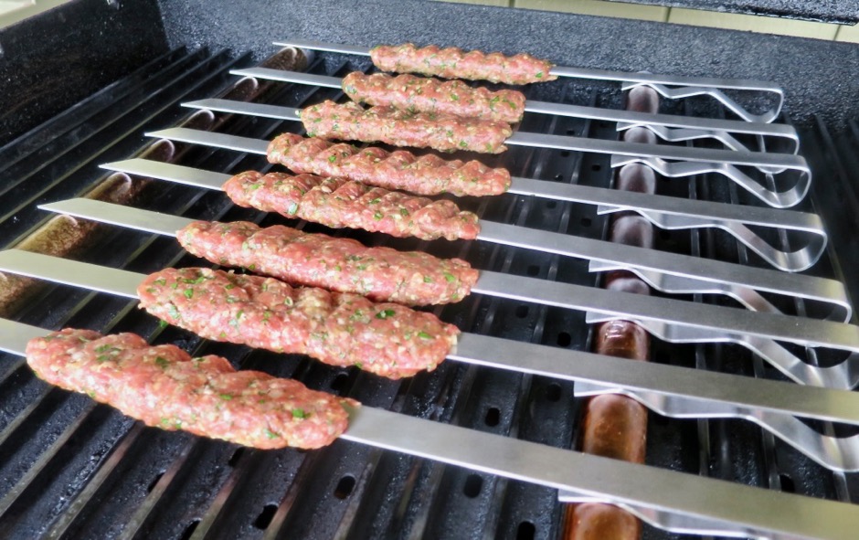 The first few times we grilled the meat on wide wooden skewers. The only downside is that the skewers burn quickly though a foil shield does help.  Since this recipe will now be on our regular rotation list, we splurged and purchased wide metal skewers through Amazon.  The stainless steel skewers are 5/8″ wide which helps to keep the meat from “spinning” as they cook.  If you use wooden skewers, use flat, wide ones.  I also feel that wrapping the meat around the skewer and pinching it together at the seam, rather than poking the skewer into the meat, helps to keep the meat from loosening up when grilling.