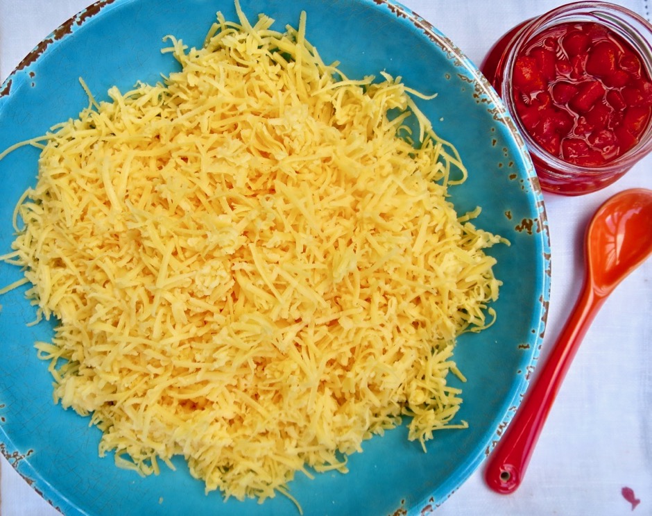 Cheddar cheese, mayonnaise, and pimentos are the three main ingredients. To add a little depth to my pimento cheese, I add a bit of Dijon mustard and Worcestershire, and sometimes a dash of cayenne pepper. Louisiana-style hot sauce is another common addition. Next time I will add some of our homemade pickled jalapeños. Freshly grated cheese is a must for this recipe. Pre-grated cheese has added ingredients to prevent it from clumping and getting moldy. These ingredients greatly affect its melting quality and taste. So get out your grater, it will take just a few minutes if that, to grate a block of cheese.