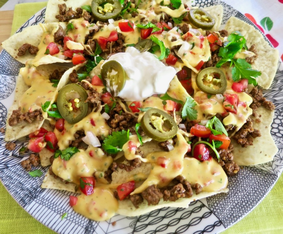Nachos! I came across the idea to use pimento cheese on nachos from South Carolina’s curiously named “Garden & Gun” web site (named after a 1970s Charleston disco called the Garden & Gun Club). This turned out to be the best cheese sauce for nachos. Once melted, it is easy to drizzle over the corn chips and other toppings.