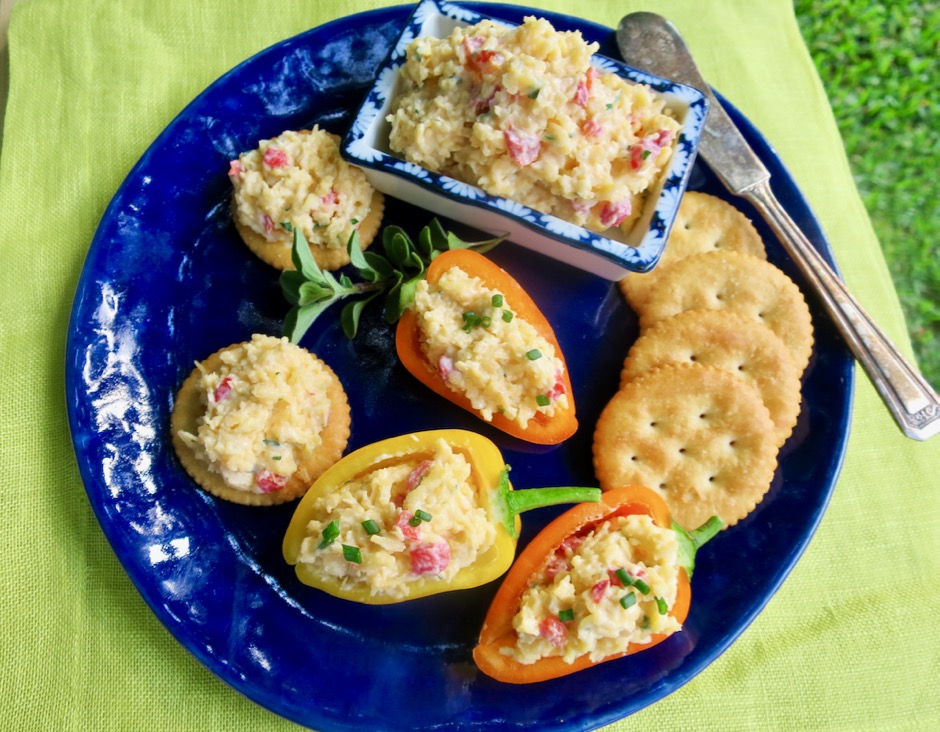 Pimento cheese is a divine dish, known in the American South as Carolina caviar, Southern pâté or caviar of the South. There are numerous ways to enjoy it whether it’s right out of the bowl spread on crackers and crunchy vegetables, or melted and drizzled over scrambled eggs or nachos. Pimento cheese makes a wonderful grilled cheese sandwich and I can’t imagine a better spread on a warm, buttery biscuit or over a grilled burger.
