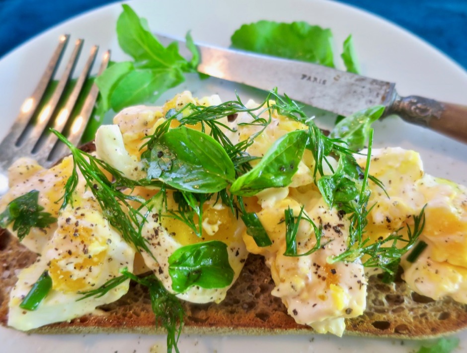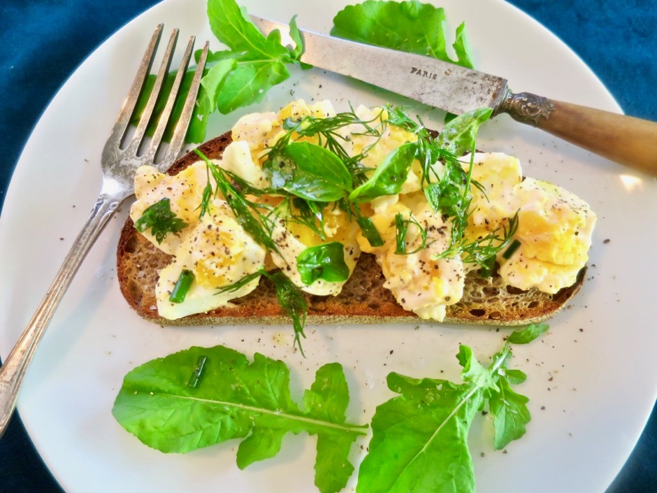 Anyone who visits this blog will have noticed that eggs are one of my favorite foods. I’m especially fond of the 6 1/2 minute egg with its perfectly set white and jammy yolk. I also love egg salad on John’s homemade bread now and then. In this case, the egg salad is piled on toasted country sourdough bread with herbs scattered over the top. It is delicious for breakfast, lunch or even dinner and ever so simple to prepare.