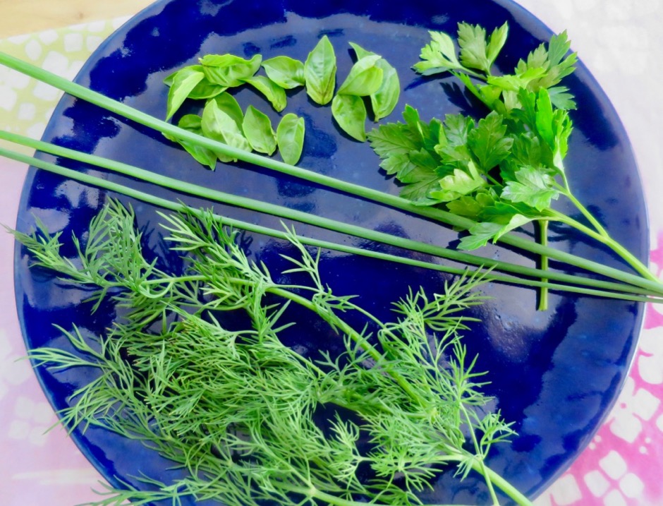 The original recipe calls for dill, chives and basil. I added a few torn sprigs of parsley from the garden. This combination is perfect, however, you could switch them out with whatever fresh herbs you happen to have on hand. The lemon juice adds a nice zing to make the perfect egg salad toast.